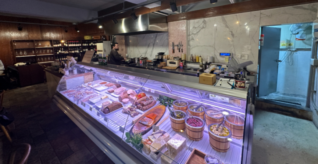 - 매장 내부의 원목 인테리어, 와인 셀러, 햄이 진열된 쇼케이스가 인기 포토존.