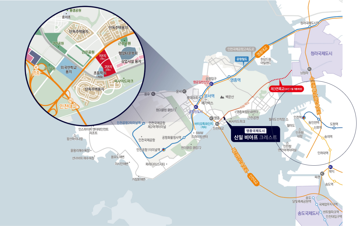 신일 비아프 크레스트가 가장 주목받는 이유 중 하나는 바로 탁월한 입지입니다. 영종국제도시는 인천국제공항과 가까워 교통이 매우 편리하고, 송도·서울·경기권 주요 도심들과의 접근성이 뛰어납니다.