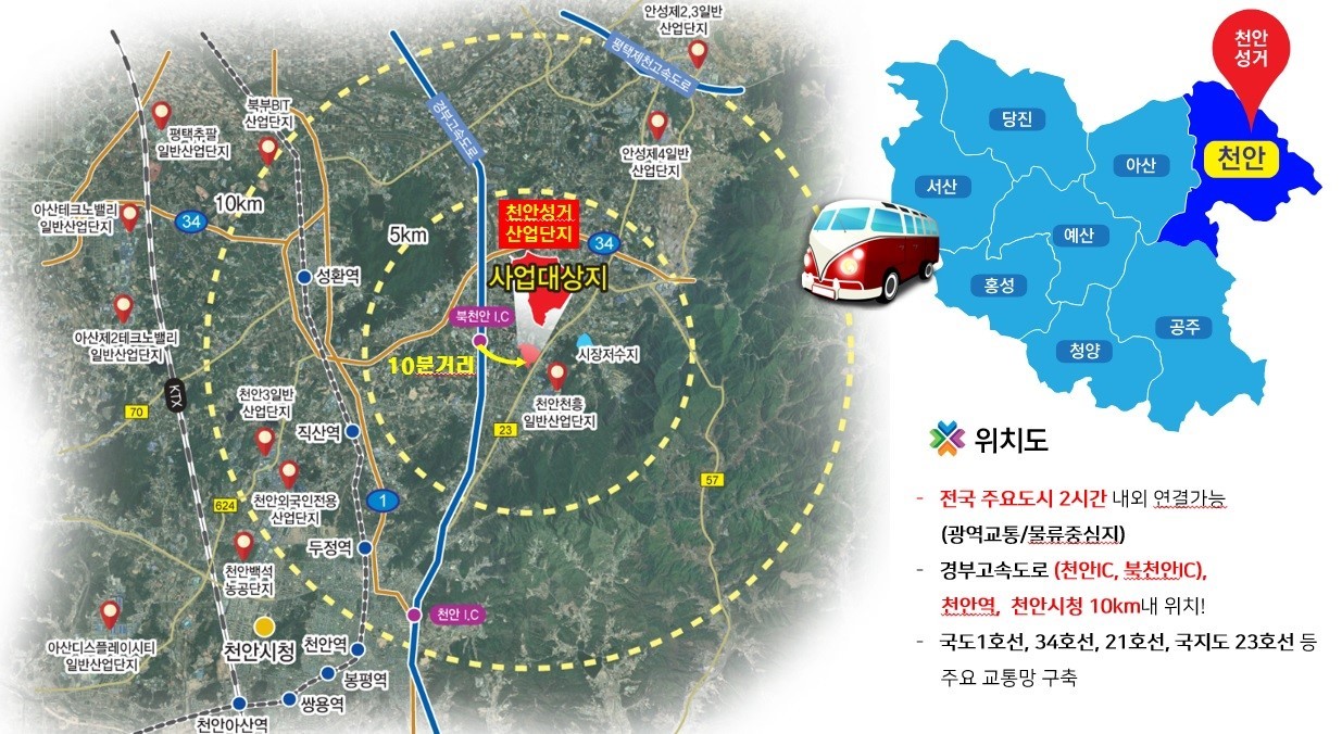 - 북천안IC, 남안성IC, 경부·평택제천·서해안고속도로 인근